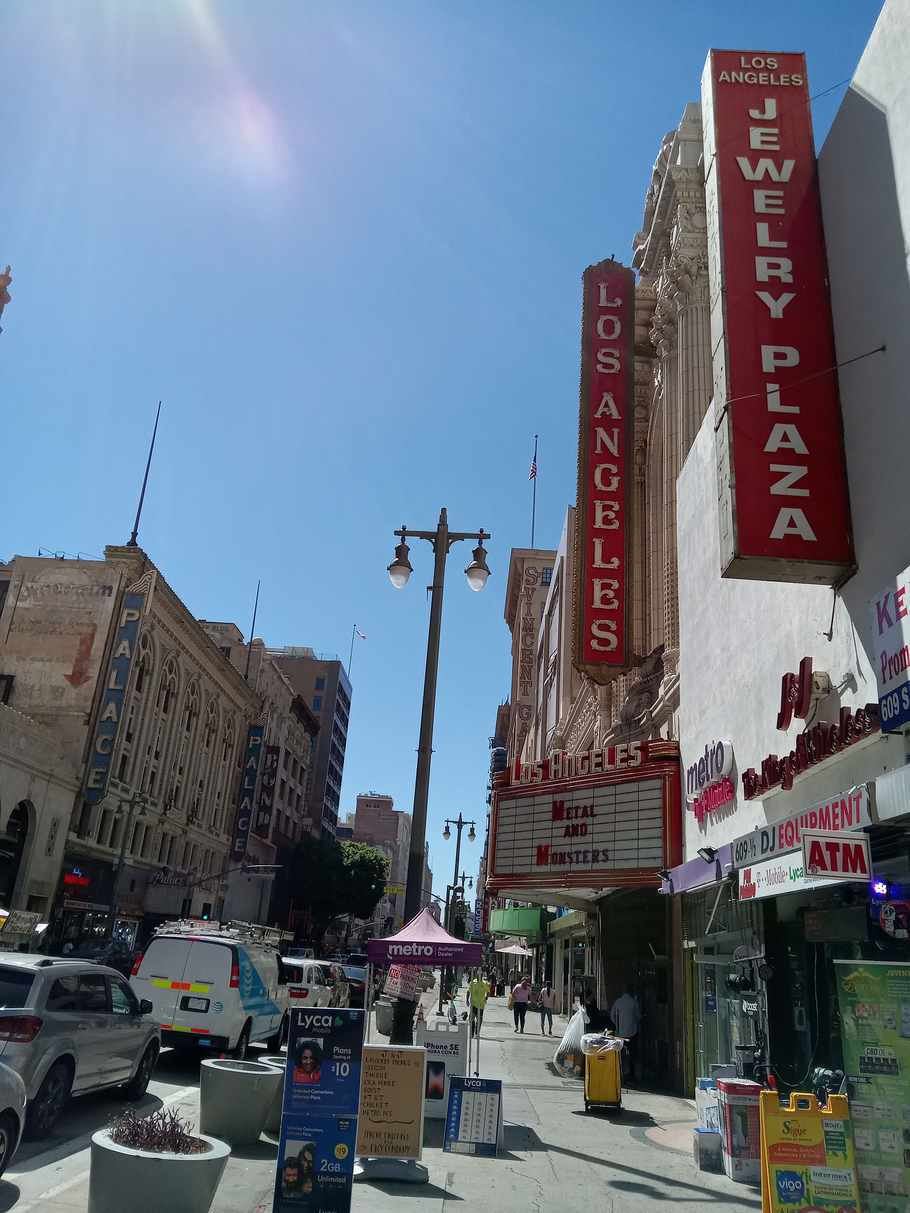 As the name might suggest, Broadway is also home to a number of historic theaters, some of which have been refurbished and are back to hosting concerts and events. The Los Angeles Theater had something going on called Metal and Monsters. The Globe was advertising travesuras, which translated to antics, or mischievous conduct, when I looked it up. Joe Satriani was playing at the Orpheum, and a few blocks over, at the Mayan, there were two acts on the marquee, Minimal Effect and Detroit Love.
