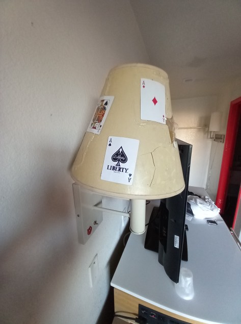 I’d lived in cheap hotels like this one for years. They were my joints. Now I wasn’t even sure if the bed was fit to sleep on. The lampshade was all busted up, but someone had patched it up with playing cards, two Aces and a Jack. Right beside it, someone had suggested what all cops can do to themselves. It’s not an adventure if you get too comfortable. I had a long, classy night ahead of me.