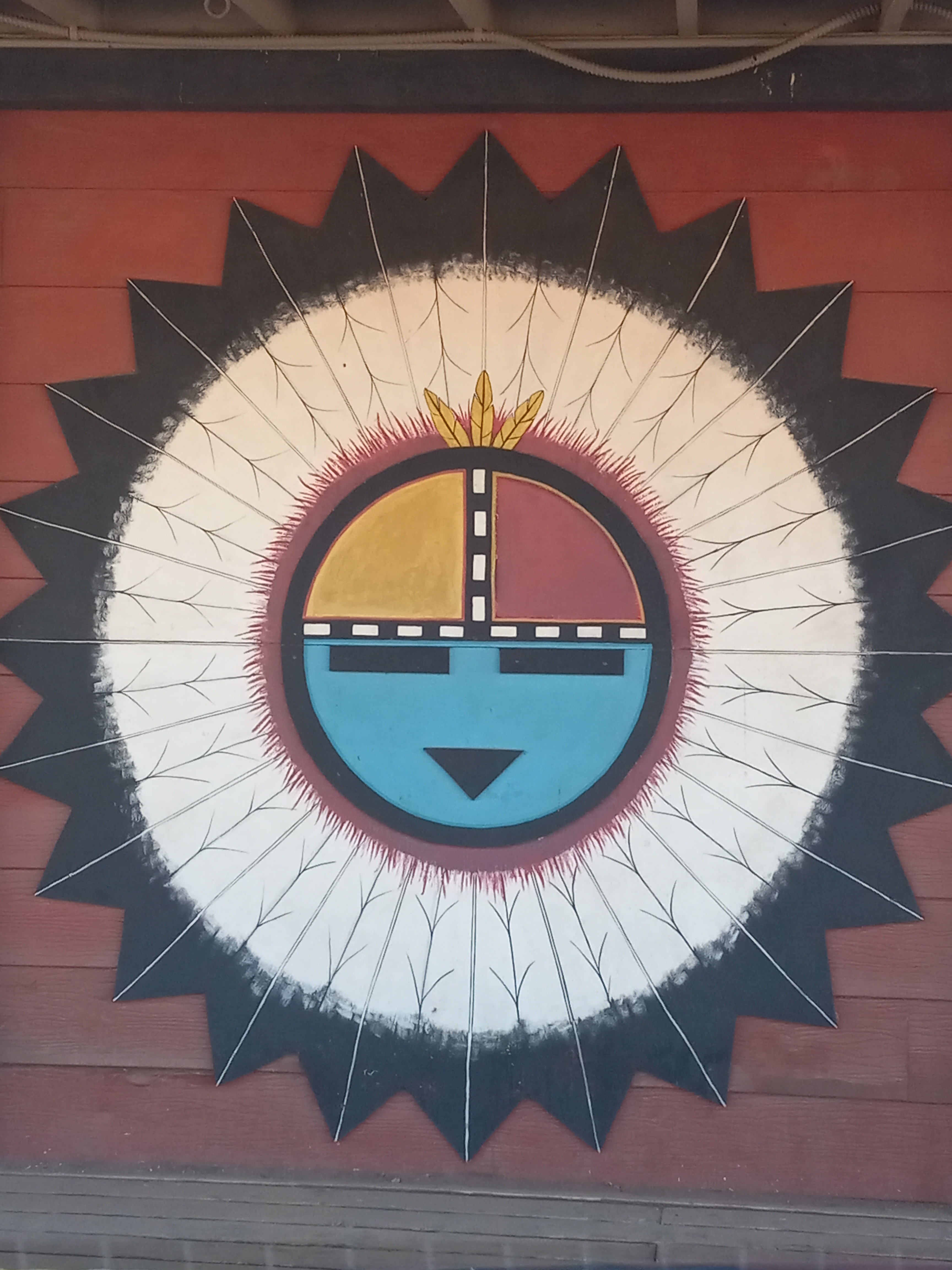 A mural in town showed dancers beneath a rainbow and settlers with their wagons. Another showed Native families, the men in yellow shirt and red bandanas, with their horses, cows, sheep, and goats. In one window was a stuffed mountain lion and huge rack of antlers. In a second, were kachina dolls of every color and stripe.