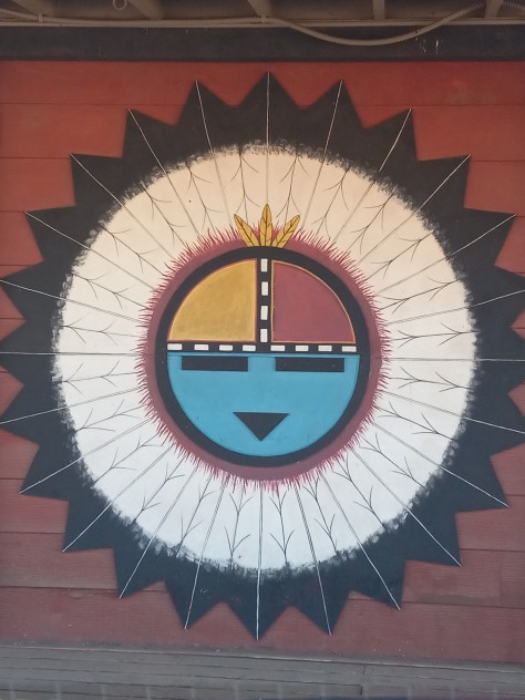 I took a scenic drive to get there, taking the 40 east, but then veering south on the 53, passing the Bandera Volcano and Ice Cave, the El Morro National Monument, and then briefly stopping to visit the Zuni Pueblo, once part of the Seven Cities of Cibola, sought by the Spanish explorer Vasquez de Coronado. There was a visitor center I went into with maps and black and white photos, and also a few gift shops I stopped outside of. Most places weren’t open yet, but the art outside was fantastic, butterfly dancers, corn maidens, kachina dolls, ads for turquoise and silver jewelry.