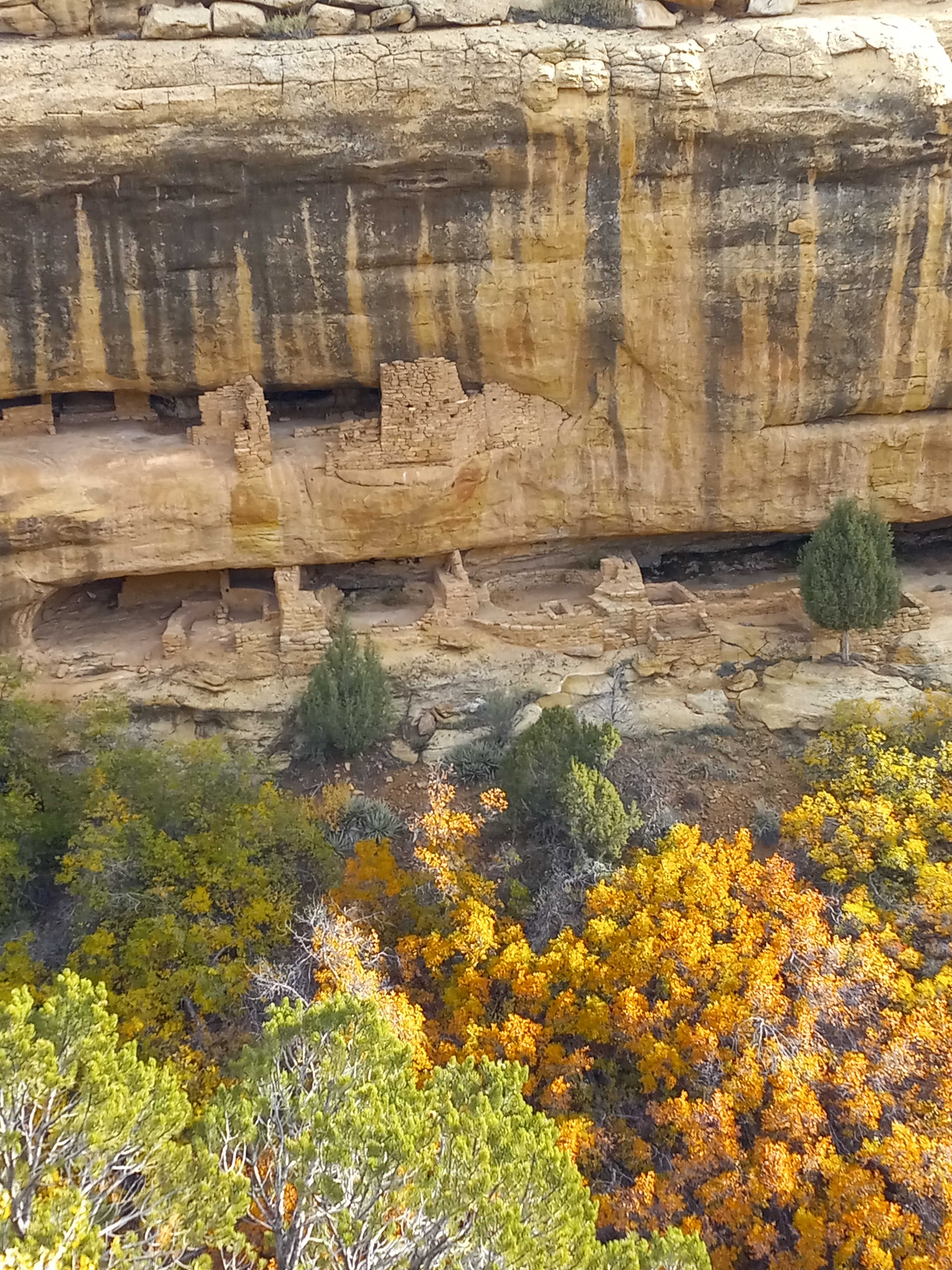 Running as if I were being chased, I moved on to the Pueblos and Pit Houses. I could hardly contain my exasperation as I got out of the car. There was more to see ahead. So much more to see. When I got to the Sun Point View the village there was partly obscured by trees. What I could see of it, once again did resemble a termite mound. The Oak Tree House was closer and a better view. There were three large circular rooms and a few adjoining ones. The Sun Temple was right in the open. You could get out and wander around it.