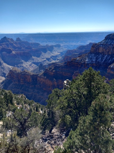 I’d been to the main attractions on the south rim a handful of times, but this was the first time I’d be visiting the north rim. Now I was on the 89A, taking the 67 south at Jacob Lake. It was another hour to get to the north rim. The day was clear and the sun was shining brightly through the windshield, but there was snow on both sides of the road, with pine trees sticking out of it like dark green cocktail toothpicks.