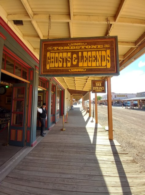 Wyatt Earp looked out the door at me as I approached Tombstone Ghosts and Legends. I told him he looked like Kurt Russel. He said he got that a lot. I passed Ike Clanton’s Haunted Hotel and Russel’s Roadrunner Stetson. Dwarf Wrestling was coming to town. Also, How the West was Fun.