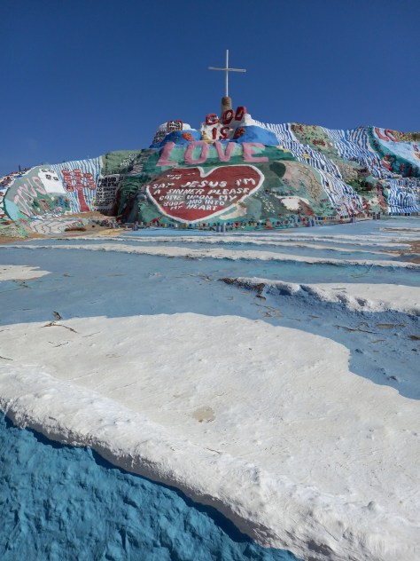 A cross sits on top of the painted hill, and abandoned vehicles, similarly adorned with paint and scripture, around it, like toy cars in a sandbox. God is Love. Love is Universal. The Holy Bible. Salvation. Jesus loves You. Around a trailer sat hundreds of empty cans. The artist had gotten his point across. Salvation Mountain resembles a giant confection, all sugar, and gumdrops, and frosting, like something Hansel and Gretel would’ve broken into looking for candy.