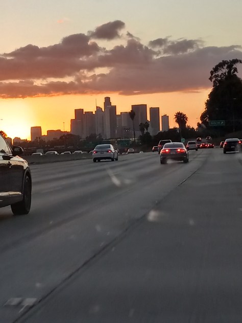 I took the 10 all the way to Los Angeles, passing Redlands, San Bernardino, and Riverside. It was twilight as I reached the outskirts of downtown and I got caught up in the stop and start traffic. I knew the city well, yet didn’t know it at all. It had been more of a death star than a home, one of life’s cruel jokes, to have my only base in the world be such an impossible to navigate logjam. The sun was setting just to the left of the skyscrapers, the sky beside it orange and capped with clouds.