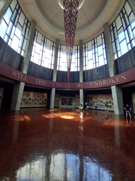 There was also an exhibit about the Outlaw Country movement that sprung up in Texas during the 70s, songwriters like Willie Nelson and Waylon Jennings, who grew their hair out and injected some rock and roll attitude into their performances. The Hall of Fame itself, is a circular enclosure with plaques on the walls commemorating those who have been inducted. To the young people pedaling bicycle bars around out front, most of the names on the wall probably meant little.
