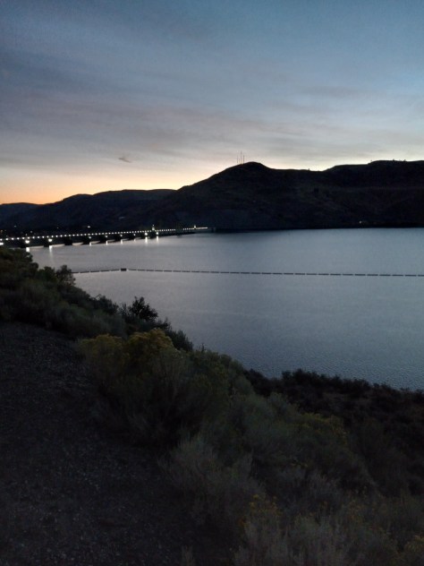 Before hitting the road, I wanted to go sit and meditate beside the dam. I pulled up at an overlook beside the visitor center and sat down on a rock. The faintest light of day was just showing behind the eastern hills. It was cold, and though the wind had died down some, it was still gusty. I went back and sat in the car, looking down at the lights of the dam, the ropes and buoys stretched across the surface of the water. The window was down, and I could hear the cry of waterbirds below.