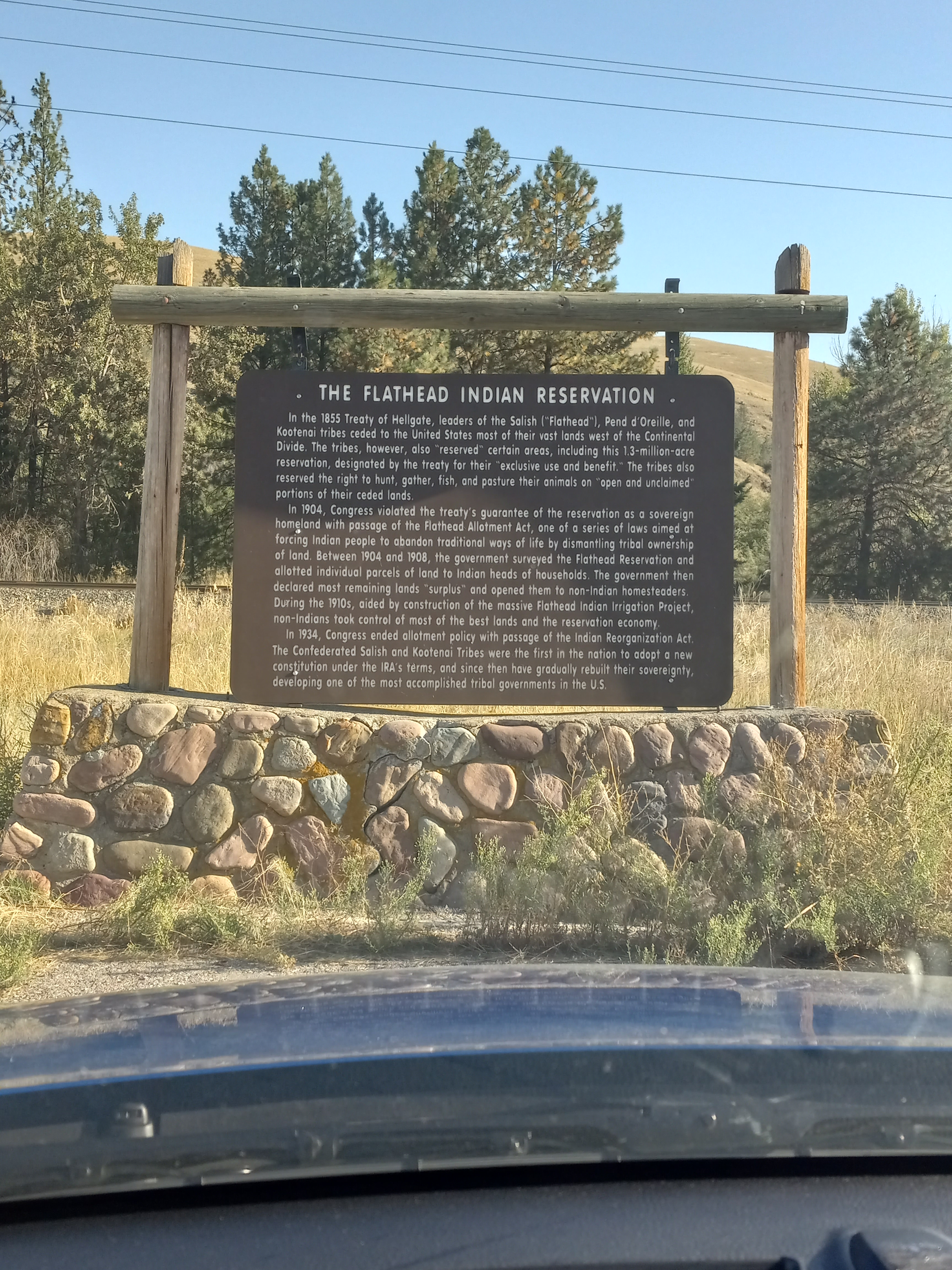 The reservation was established in 1855 when the Treaty of Hellgate was signed. It occupies two thousand square miles, with only nine thousand of the population of nearly 30,000 identifying as Native American. Like what had happened with the Nez Perce, this came about when the government began allotting lands to individuals instead of keeping the holdings communal. Like the other reservations I’d driven through, there weren’t many obvious signs I was even on one, just ordinary houses and businesses, the land looking roughly the same as it did outside the borders.