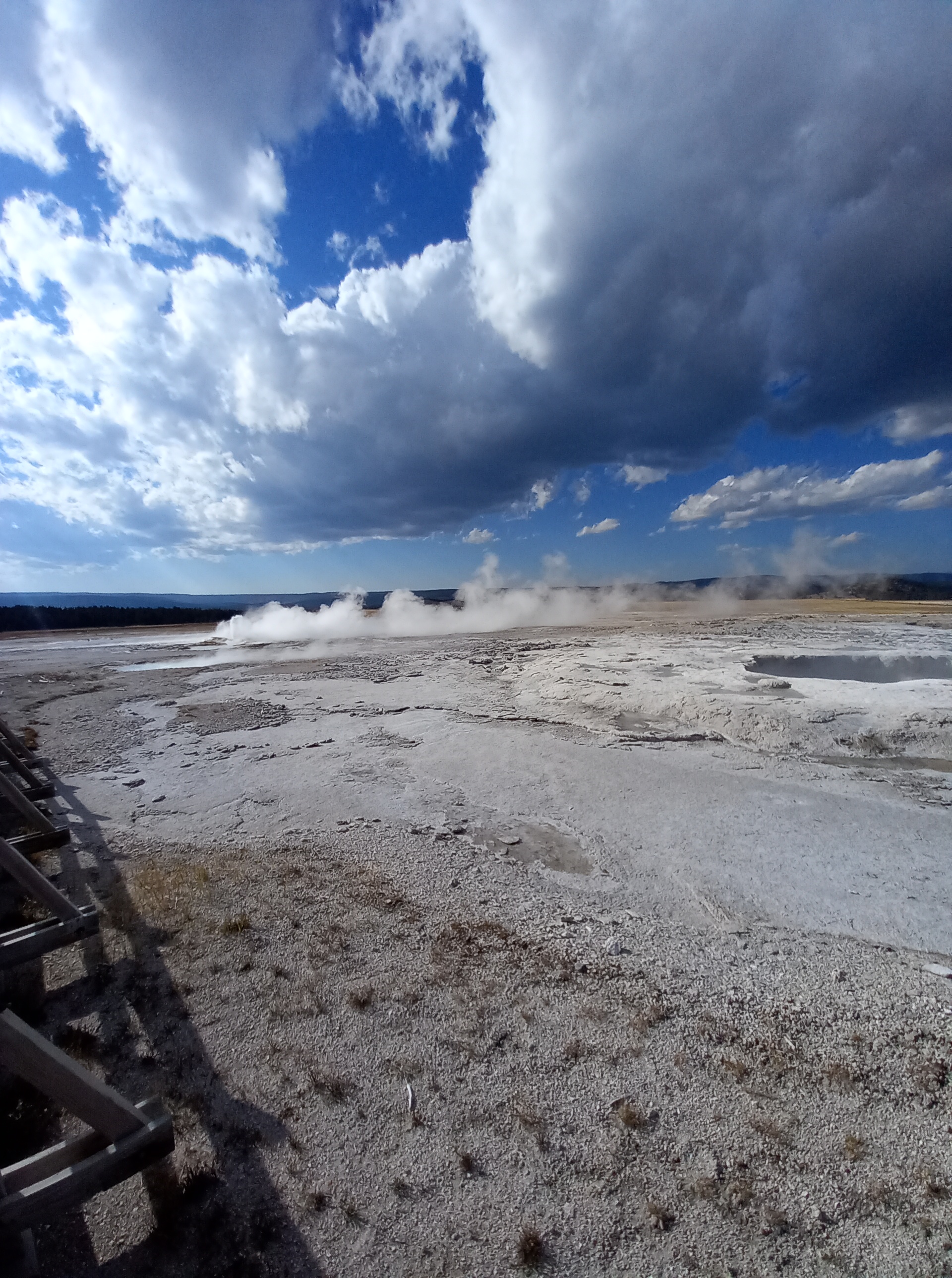There were a lot of visitors when I pulled over at the Fountain Paint Pot Trail, but it could’ve been way worse. There were still places to park and a little room to roam. A sign at the entrance warns of boiling water and unstable ground. It was like taking a Spirit Walk, no drugs or initiation necessary. The landscape was that revelatory, a place where the sky and underworld meet, a collision of elements and minerals, danger, and shape-shifting vapors.