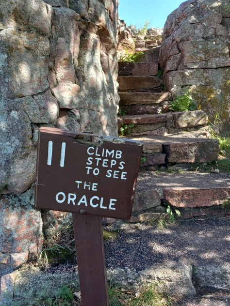 The path ran through a meadow, past prayer flags tied to the branches of a tree. I came to the red quartzite cliffs, then approached a sign announcing The Oracle. It was eleven steps to reach it. A sign on the oracle said, Look Through Here, and pointed to a hole. Gazing through it, I could see the profile of a Native American, a natural formation of the stone. Walking further, I came to a waterfall, then climbed stone stairs at the side of it to reach the top. It was hot, only slightly lesser so in the shade. It was a walking meditation I was on, at least that was the idea behind it. I was finding it hard to sit still these days.