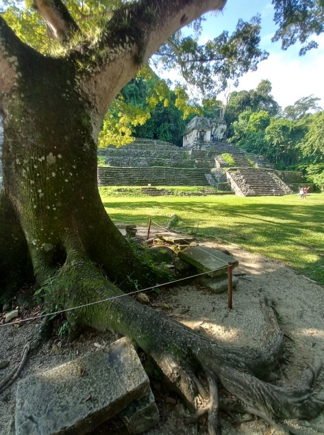 I stared my tour by sitting on the ground across from the Temple of Inscriptions and taking a picture of Laguz, propped up on a bench. The Temple of Inscriptions is where the tomb of the king Pascal was excavated. He and his son, Chan-Bahlum, or Snake-Jaguar, were responsible for making Palenque a great power in its time. There were howler monkeys in the jungle, their roar as loud and terrifying as that of a jaguar, but they kept themselves hidden.