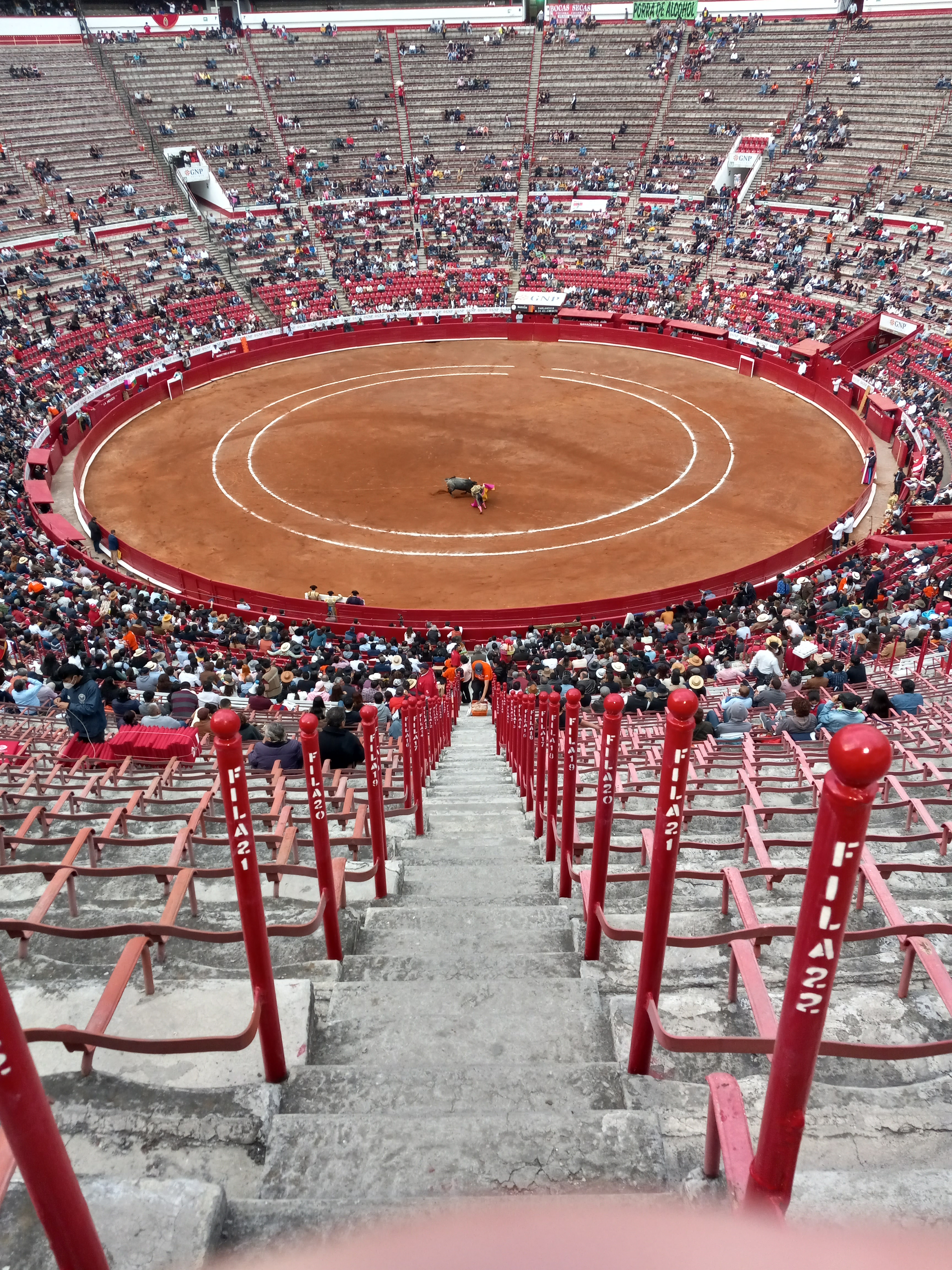I started for the bull ring in the late afternoon. After getting off the Metro, I followed my written directions and got lost, needing to ask directions and turn around before I could follow the flow of foot traffic and make my way to the ring. What a grand ritual, the dance of death, on its way to being outlawed the next year. There were more protestors out front protesting the brutality of the fight then there were spectators to watch it. That was a first.