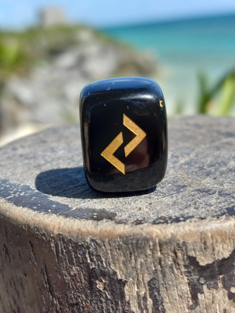 Jera looks like two arrows back-to-back, the right one slightly higher than the left. It is the rune of celebration and relates to the harvest which comes after much work and tribulation. The month for it is August and its moon is the Harvest Moon. It is the time of the year when the crops are gathered. Drawing this rune signifies a major turning point. Misfortunes will fade, projects will be completed, new dreams will come to life. This may mean a new job or a new home. It is time to reap the rewards of all the efforts of the past.
