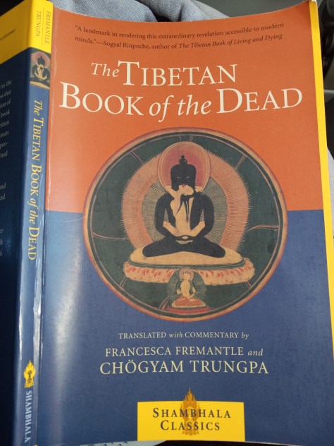 Since my seat was in the aisle, I had nothing to distract me from trying harder to crack the Tibetan Book of the Dead for the next two hours. I was just looking to get a basic grasp on it, but even that proved elusive. What I already knew was that it is a text that is read aloud over the body of a person who has recently deceased. There are forty-nine days that the soul of this person travels, in search of their next incarnation. The text is meant to be a comfort and guide to them, to help explain to them what they are experiencing and lead them in the best possible direction.