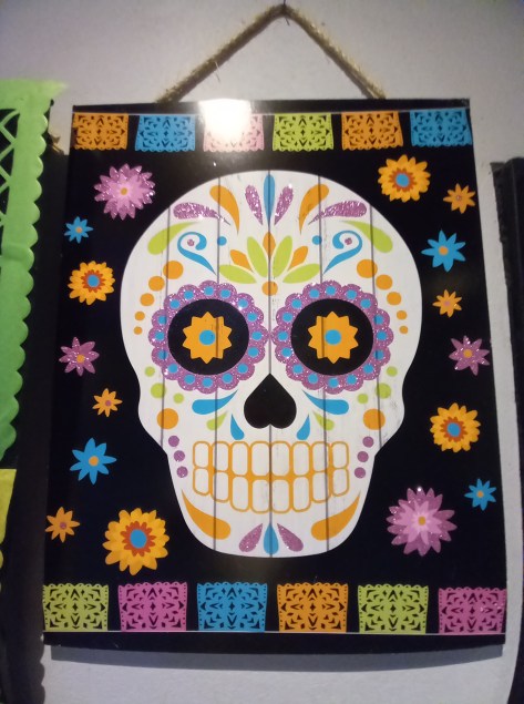 As soon as I stepped into the terminal, I was greeted by a large ofrenda for Day of the Dead, yellow marigolds in pots, leading to a stairway adorned with baskets of fruit and white skulls. Inside a ring of the same flowers, a skeleton dancer held out her red and blue hoop dress with bony fingers. Alongside her, another skeleton with jewels around her eye sockets, clutched the empty spot in her chest where a heart had once beaten.