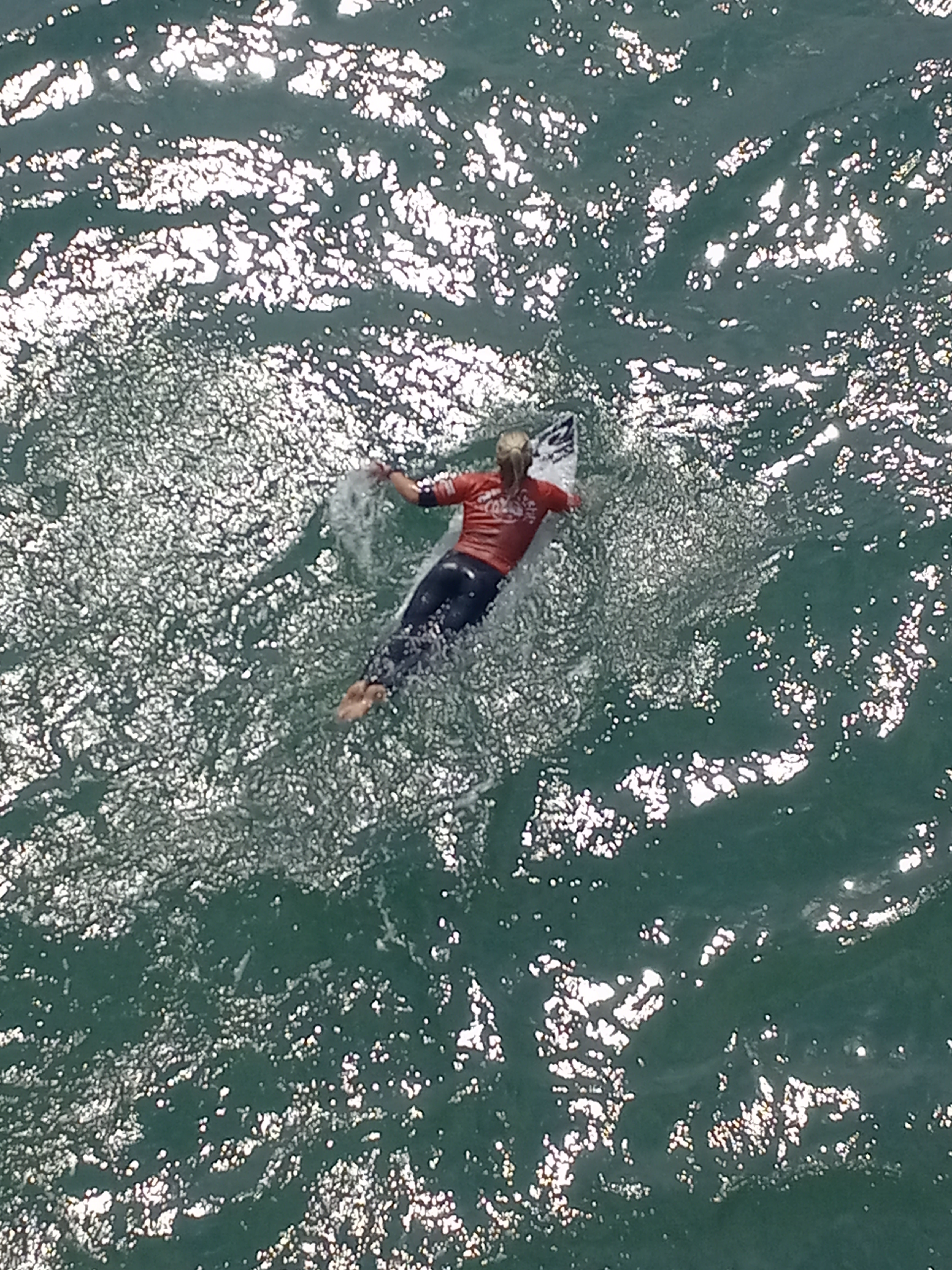 Although the waves were big, there weren’t many rideable sections, and there was a treacherous current from the south. Indeed, during the first heat of the day, one of the women in the Challenger series ended up too close to the pier and couldn’t get out, paddling in place for the next five minutes, barely ducking beneath the murderous sets. The lifeguards on their jet-skis hovered in readiness,