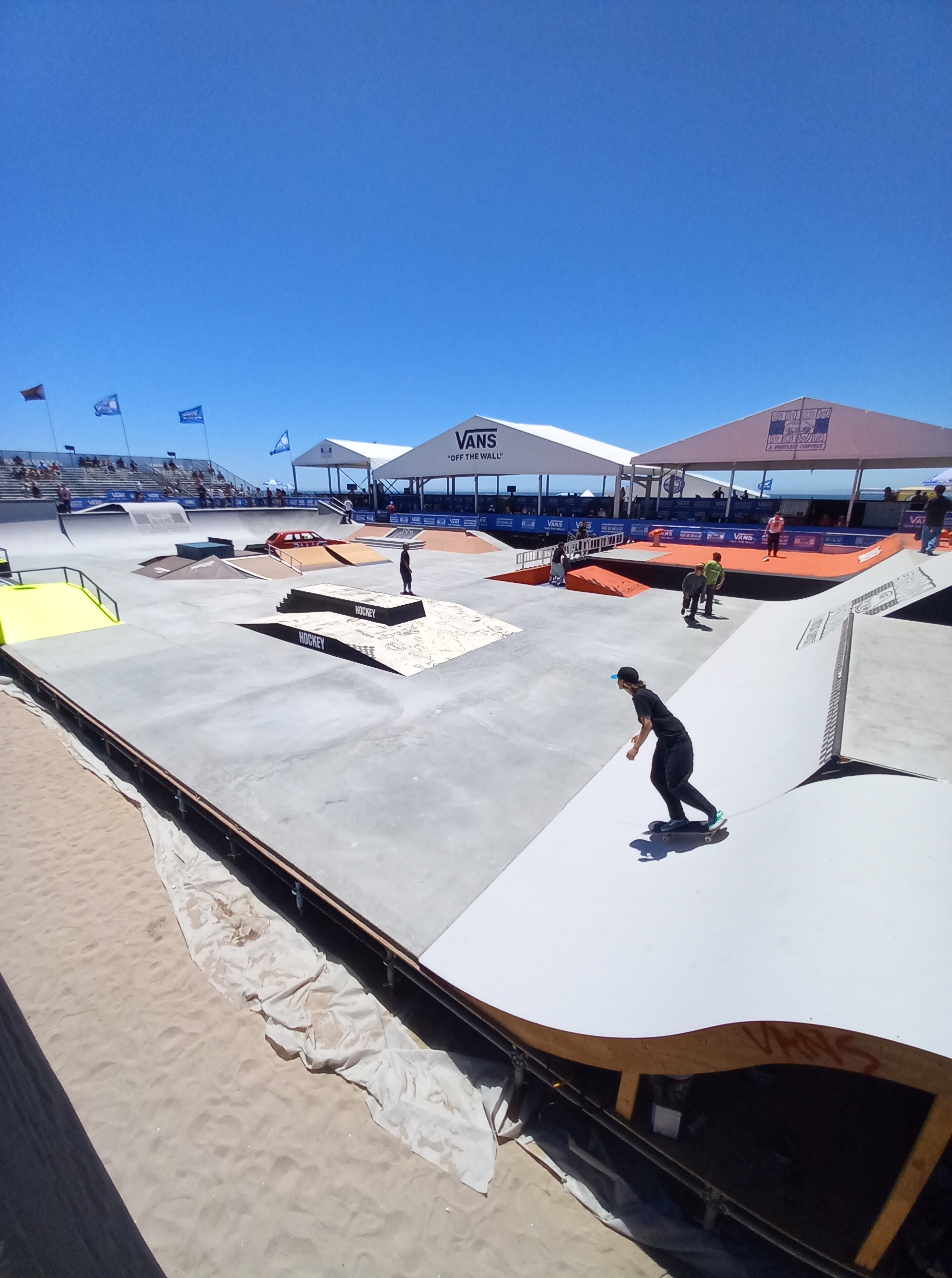 The day might’ve gone downhill from there, but I ran into Betsy, along with a visiting friend of hers, Anne. They were interested in checking out the skateboarding, so I walked that way with them. Hatch came along, walking his bike beside mine. When we got to the Van’s Village, he didn’t have a lock, so I used mine to lock both our bikes together, needing to stretch it as far as it could go to make that happen.