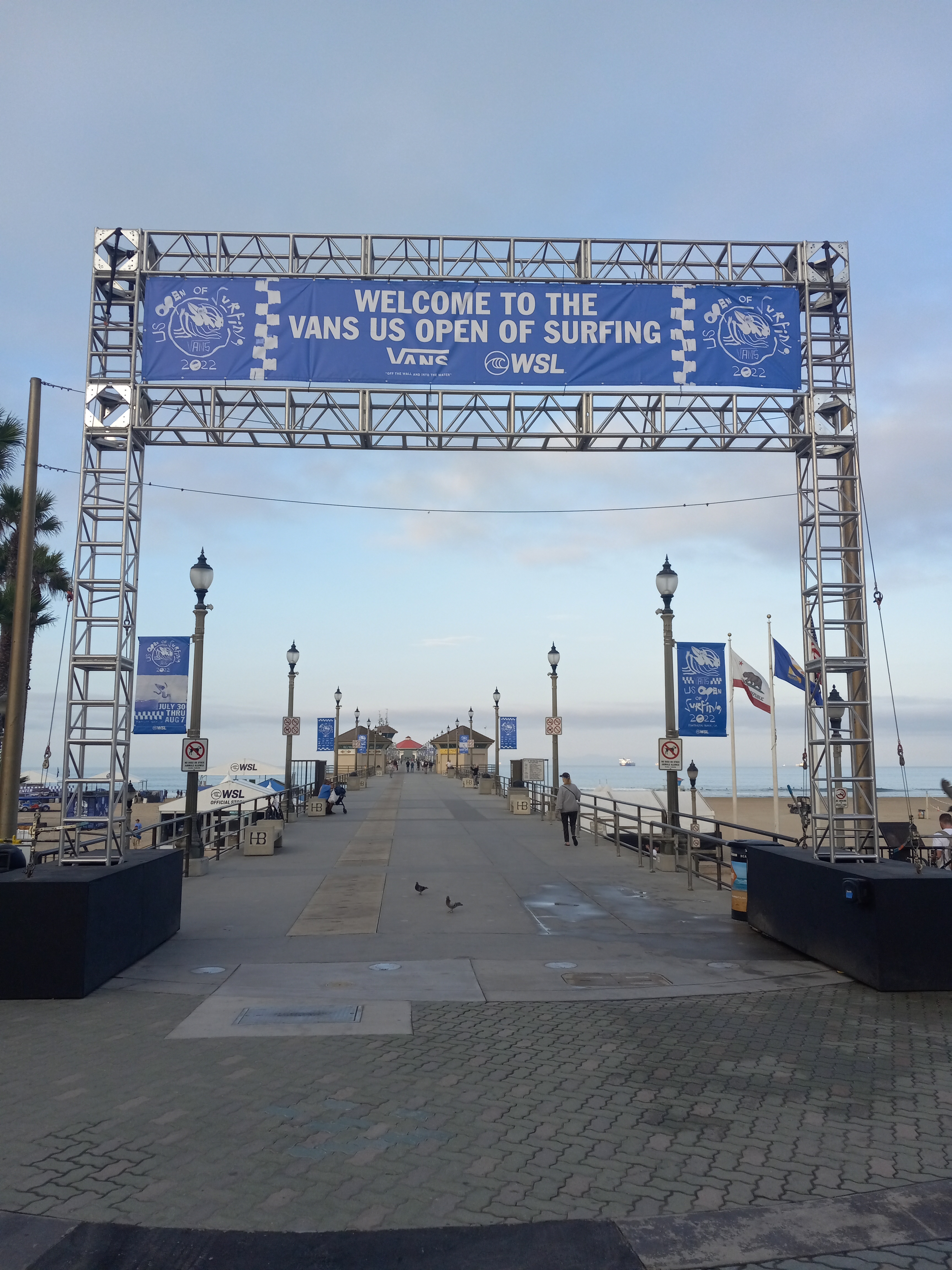 Sitting at the stoplight on PCH, I could see a blue welcome sign at the entrance of the pier. Blue banners were strung up on the light poles, all the way to the end. The sun was just now rising in the east, and outside of a few photographers, bustling to stake out the best positions on the south side of the pier, the morning was quiet and calm. It wouldn’t stay that way for long. It was the first day of the Van’s US Open of Surfing.