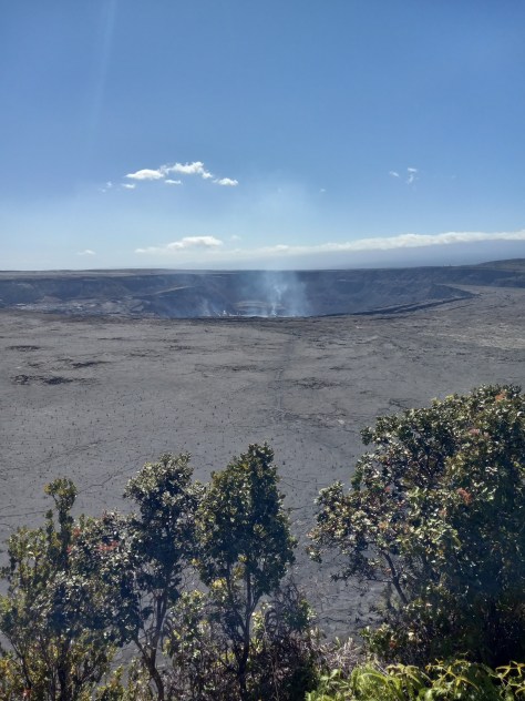 The section of the Kilauea Caldera that I chose to walk ran from the Visitor Center, behind the Lava House, and down to the Lava Tubes, a few miles each way. There was a longer hike that took you closer to the rim, but I was worried about catching the bus back to Hilo in time. I passed through a tunnel of ferns before reaching an overlook. The volcano sat puffing away like the site of a recently exploded bomb, but there were no eruptions happening. There were a lot of tourists on the trail and in the parking lots.