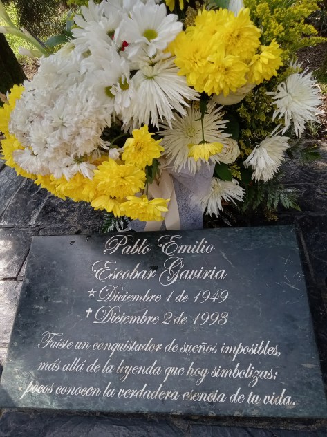 The cemetery was not difficult to find. It was just taking the A train, the blue line this time, to the Sabaneta stop and then walking a quarter of a mile. I could see the cemetery from the platform. Once I got inside, however, I had no idea how to find Escobar’s grave. I asked a security guard and he led me over to a chapel where a service was taking place. The grave was right beside it, not only that of Escobar, but those of some of his family members as well.
